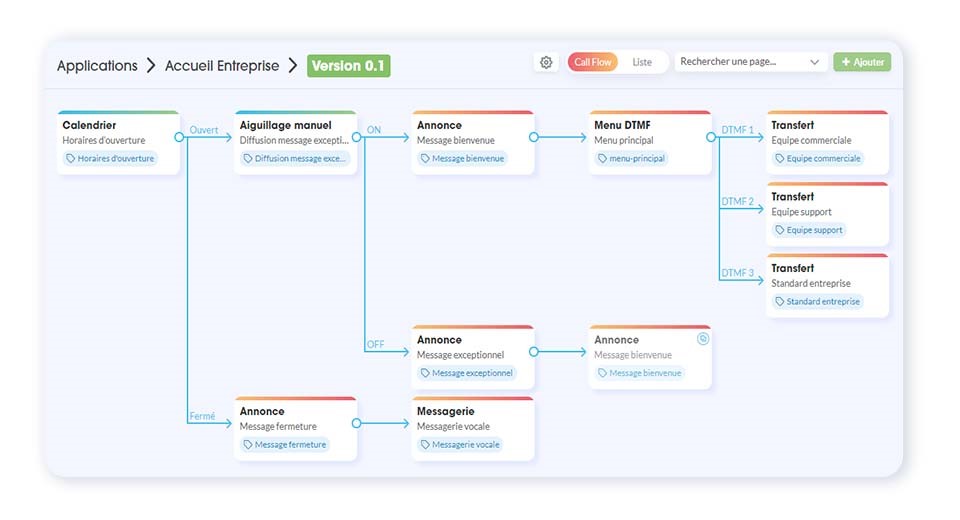 Cet environnement a volontairement été créé en low-code pour permettre à l’ensemble de nos utilisateurs de créer des arborescences en quelques clics, quel que soit leur niveau de compétences techniques. Ainsi, un éditeur visuel est mis à votre disposition pour visualiser d’un seul coup d’œil la structure de votre SVI, le parcours de vos appelants et y ajouter des étapes supplémentaires.
