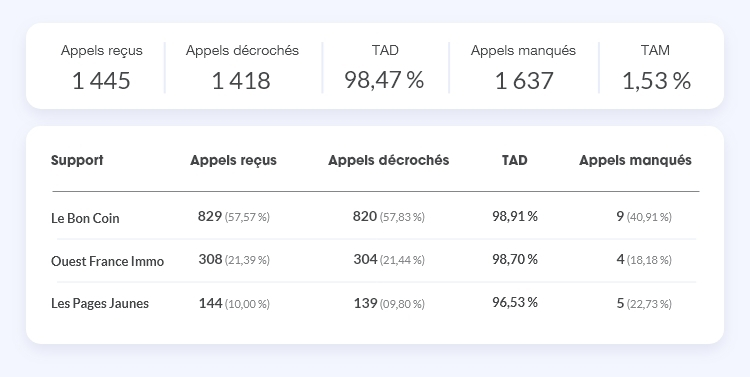 Une solution de Call Tracking vous permet justement d’obtenir toutes les données nécessaires sur le nombre réel d’appels générés depuis chaque portail, et peut même fournir ces datas par agence, et par type d’activité (Location et transaction par exemple).