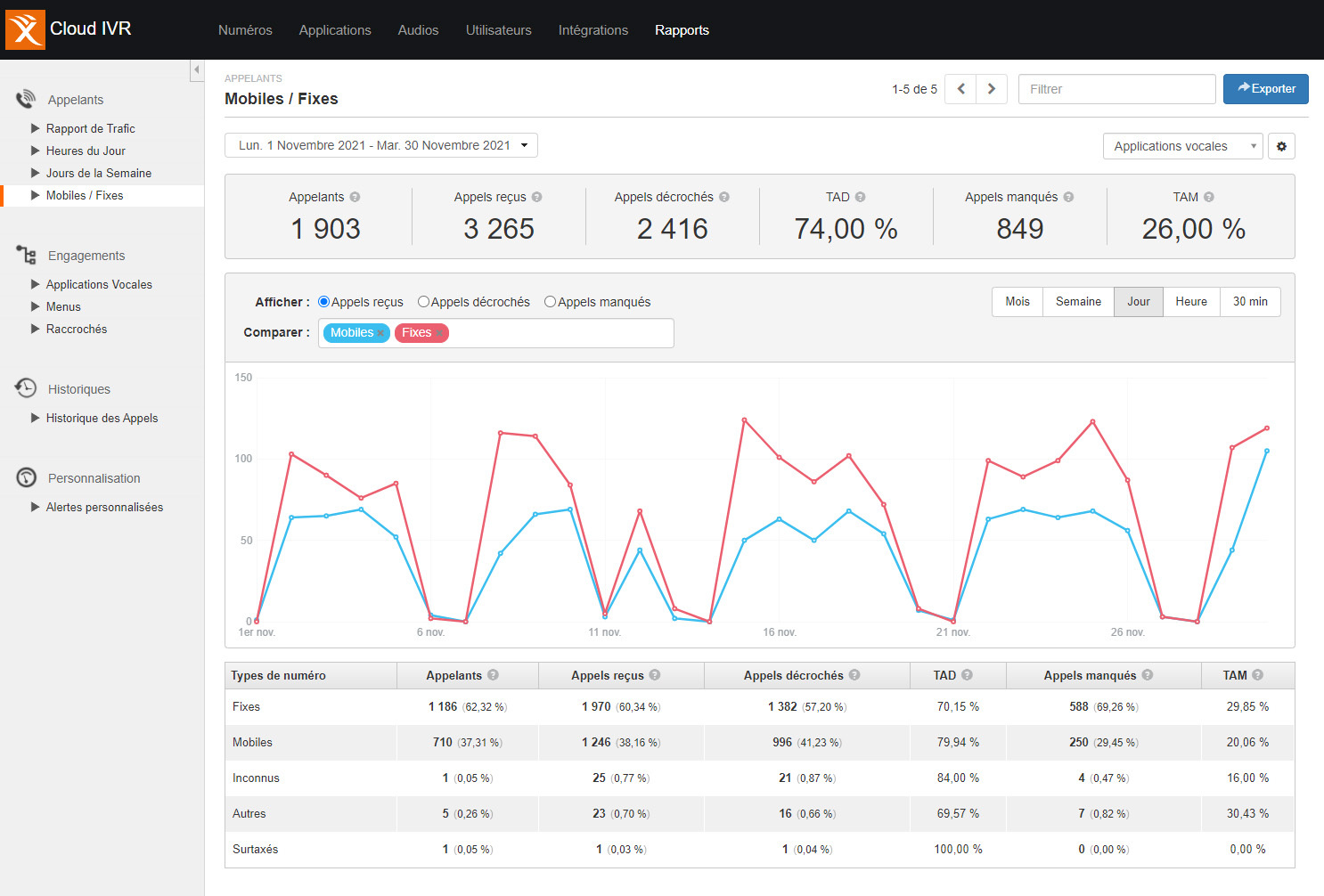 Exemple du rapport Mobiles/Fixes dans un compte Cloud IVR