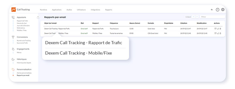 Elle vient compléter les options d’export disponibles pour vos rapports et vous permet de programmer l’envoi automatique du rapport souhaité (rapport de trafic, rapport des sources de trafic, historique des appels, etc.) par email aux destinataires que vous choisissez.