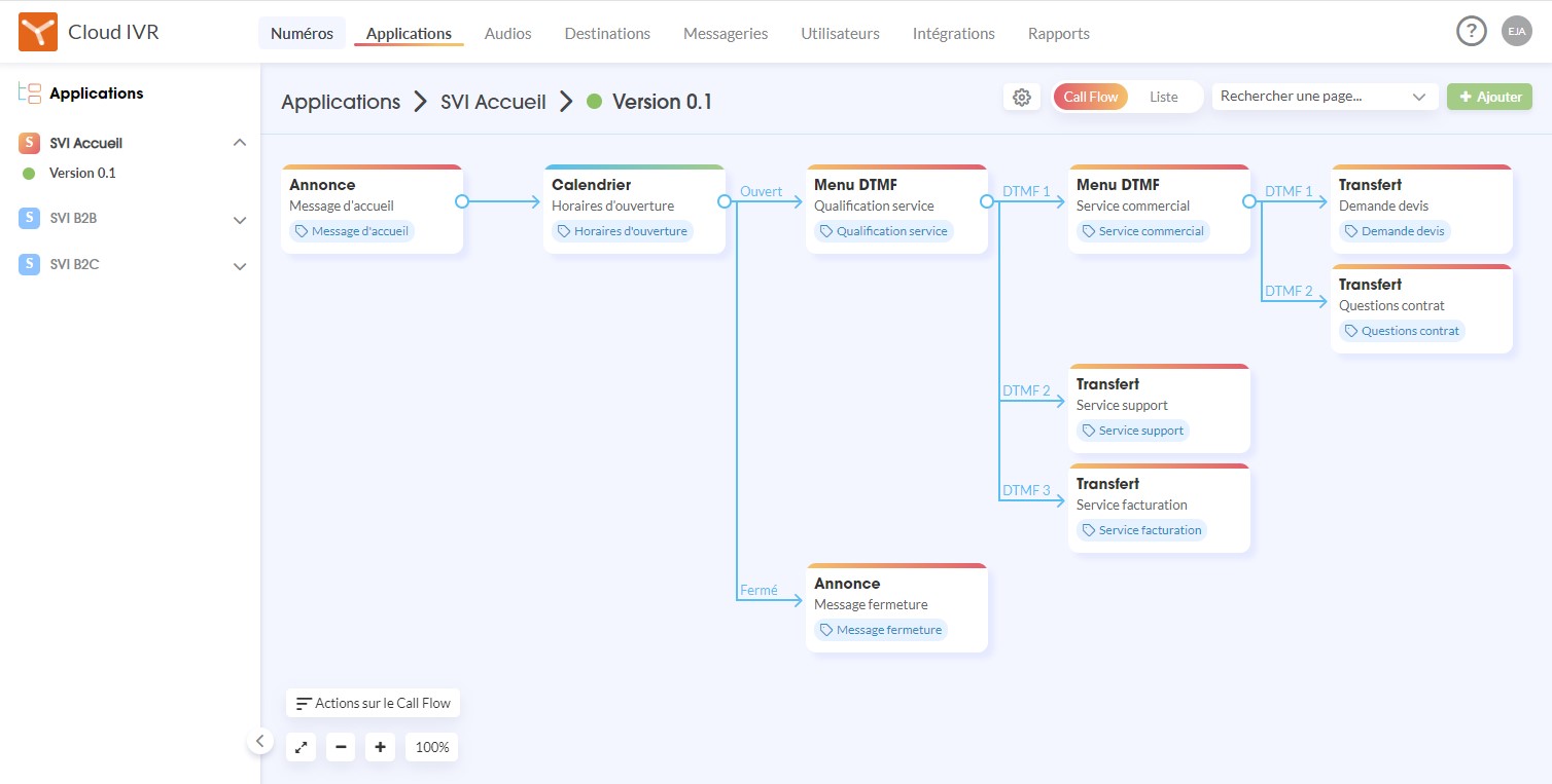 Le Call Flow est la structure du serveur vocal interactif qui définit le cheminement suivi par l’appelant. Il est généralement représenté sous la forme d’une arborescence, composée de plusieurs étapes.