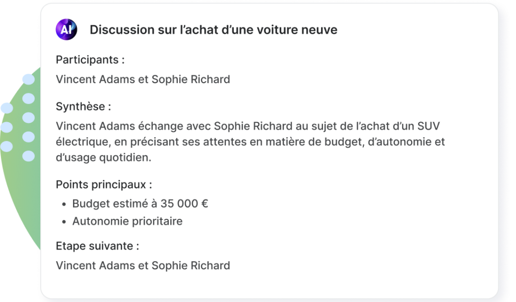 - Synchronisation immédiate du résumé dans les outils CRM et métiers des équipes.